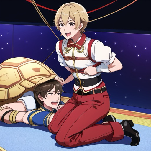 を描いてもらおうと、A◯B48のコスプレした男がもう1人の男を亀甲縛りしてて…ってぶち込んだのですが、亀甲縛りを理解しきれなかったらしく亀が出てきました。